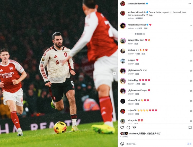 本场比赛索博斯洛伊首发出场,赛后他也在个人社媒晒出本场照片,配文写道:“一场不错的战斗,客场之旅拿到1分。现在我们将专注于足总杯较量。”